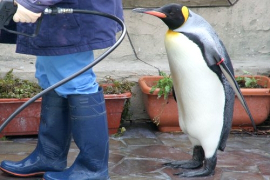 海遊館のキング、羽づくろい中です。ハラが割れている!? じつはこれがペンギンの『抱卵嚢』、抱卵するた...