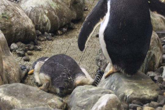 アドベンチャーワールドのジェンツーひな、だいじょうぶ? 遊び疲れたのでしょうか、バッタリと倒れたまま...