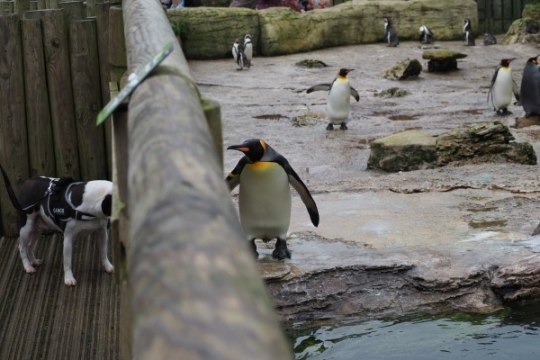 アクリル窓越しに、キングとワンコがご対面。バードランドです。イギリスはたいていのところでイヌOKなので...