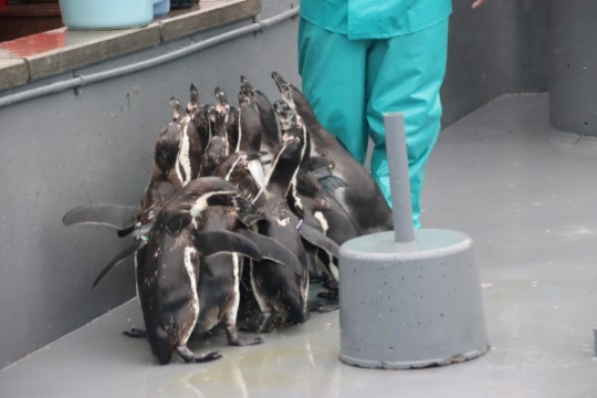 南知多ビーチランド、子育てフンボルトのプールでお食事タイムが始まりました。みんなのクチバシが、しっか...