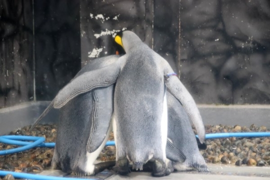 越前松島水族館のキングが3羽でなんだかわちゃわちゃやってます。奧の右側のキングに、奧左のキングがいら...