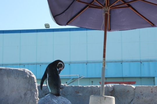 パラソルの影に入ってゆっくり羽づくろい。優雅な時間を過ごすフンボルトでした。@南知多ビーチランド