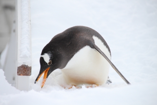ふんわりと積もった雪の上で、ちょっとボールみたいな雪塊が気になるジェンツー。慎重に持ち上げてみます。...