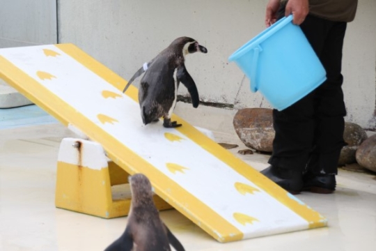 おたる水族館のペンギンショー、お次の種目はシーソーです。エサバケツから目を離すことなく移動するフンボ...
