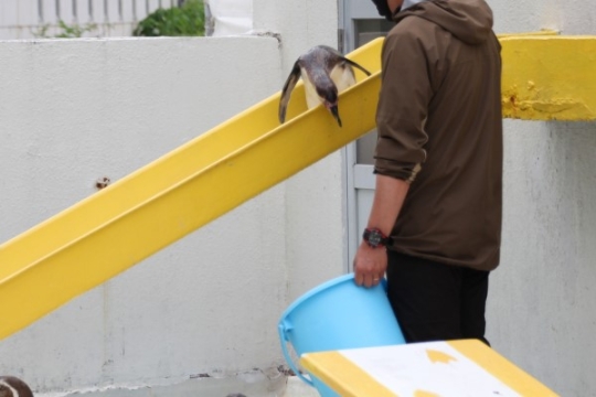 おたる水族館のペンギンショー、お次の種目はすべり台。フンボルト若鳥君大活躍です。長いすべり台を、バケ...