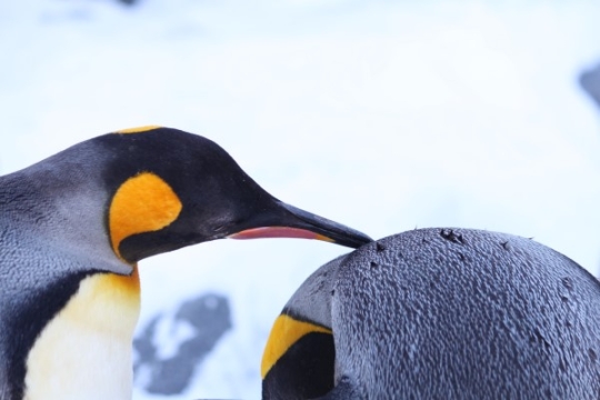冬の旭山動物園で、穏やかに仲良くしているキング。クチバシの先を細かく動かして、羽づくろいしてあげてま...