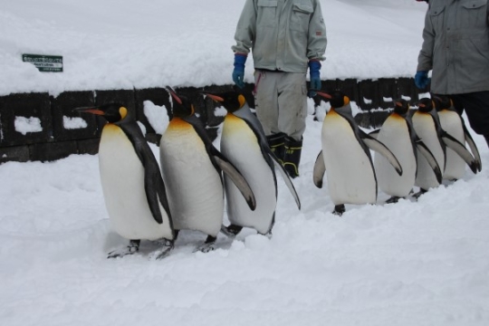 旭山動物園のペンギン散歩、キッチリと1列になって進みます。所々やや渋滞気味? 先頭から2番目と3番目...