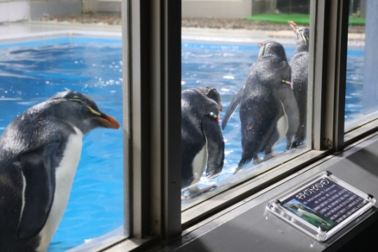 越前松島水族館に突如現れたイワトビ集団に困惑しているのは、ジェンツーも同じです。オキアミ投げ入れの時...