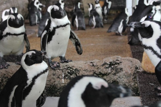 上越水族館のマゼラン、プールぎわの岩に集まっていました。マゼランは胸に二本線。顔の周囲に白線があるの...