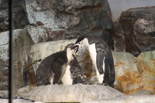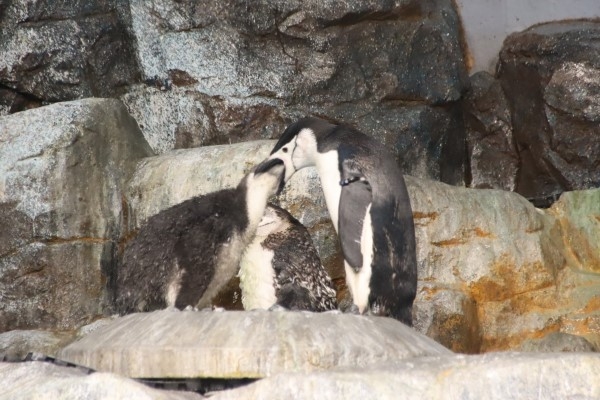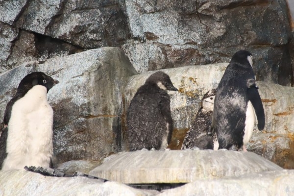 名古屋港水族館のヒゲペンギン、円い巣台にヒナ(中央)と親がいます。お隣はアデリー、奧にもう1羽ヒゲがいます。巣の外の2羽はともに換羽中のもさもさ羽になっています。