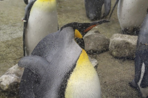 アドベンチャーワールドのペンギン王国2F、ずらりと並ぶキングの子育て用分譲区画。その1つに居を構えるキングのペアです。右の1羽、羽繕いするのにちょっとつかまってバランスをとっているみたいな相方を、じっと支えています。