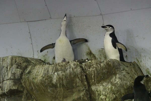 アドベンチャーワールドの海獣館です。擬岩のてっぺんに巣を構えたヒゲペンのペア。雄叫びを上げる姿が、得意げに見えます。タマゴは、あるのかな?