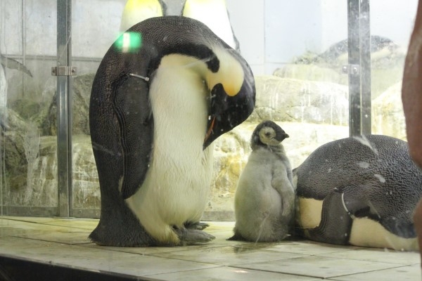 アドベンチャーワールドのエンペラー、この写真は何年か前のものです。一家がいるのは、ペンギンのメイン水槽のプールに張りだして設置された育児室です。