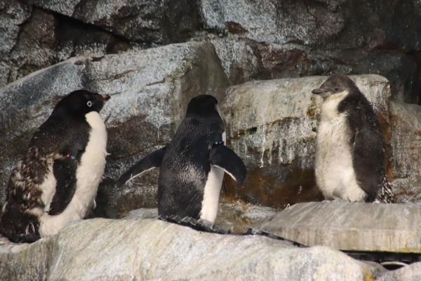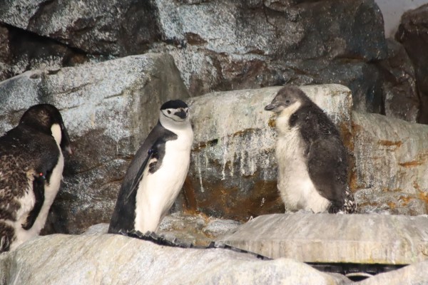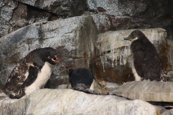 名古屋港水族館のヒゲペン一家。巣には順調に育ったヒナ、そして巣の外では親がお隣のアデリーを威嚇しています。