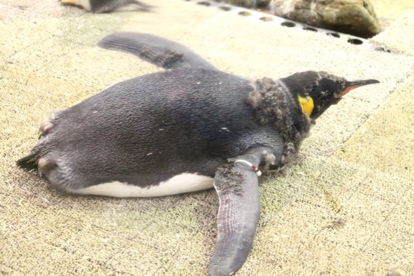 たしかに、換羽中は断食する個体もいる(野生だと海に入れないので食べられない)ので、くたびれている可能性もあり。でも、けっして病気ではありませんし、「ヒナのうぶ毛が抜けてオトナになるところ」でもありません。