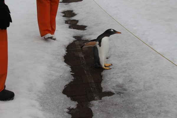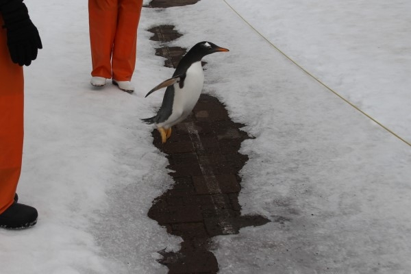 ニクスのお散歩でコースアウトしたジェンツー若。飼育員さんの指導でロープの向こう側に戻るところです。氷の割れ目を飛び越えるかのような、大きなジャンプ!美しい空中姿勢。