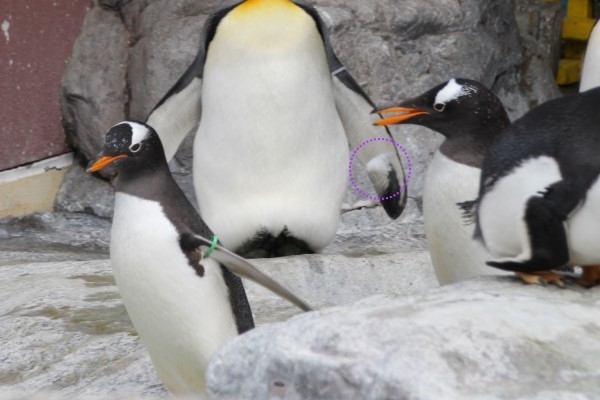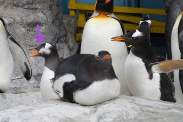 ニクスのジェンツー、突然追いかけっこが始まりました。矢印の個体が拾ったカモメの羽が気になるのでしょう。