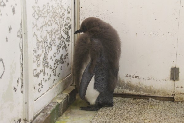 こちらがヒナから亜成鳥へと換羽中のキング、アドベンチャーワールド。抜ける前のふわふわ長い羽は全身ダークブラウン、新しい羽はハラが白で背中がグレー。そしてクチバシ全体が黒です。
