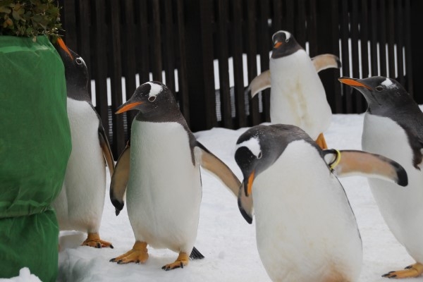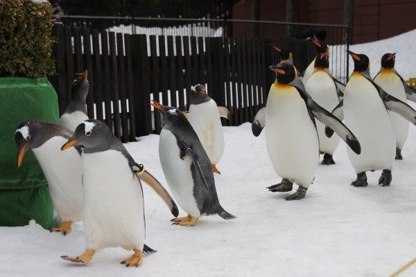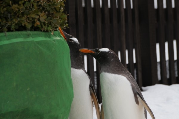 登別マリンパークニクスのペンギンお散歩、1羽のジェンツーは生け垣の葉っぱが気になってます。それにつきあってる感じのもう1羽。