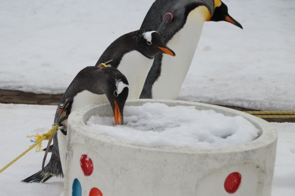 ニクスのお散歩、帰り道でプランター(ゴミ箱ではありません)を調査中のジェンツー。こちらからは見えませんが、雪の下に何かあるのでしょうか?