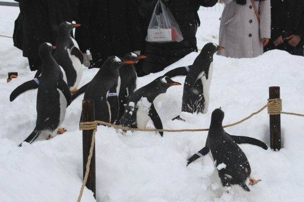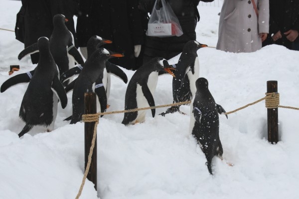 おたる水族館のペンギン散歩でコースアウトしたジェンツー。戻ろうとしますが、うまくいきません。仲間の1羽に「なにやってんだよー」と言われているような雰囲気でしたが。