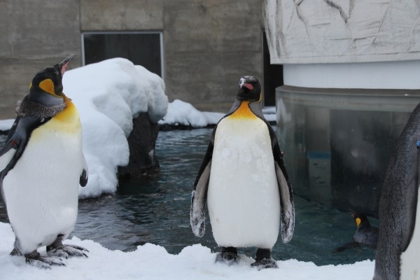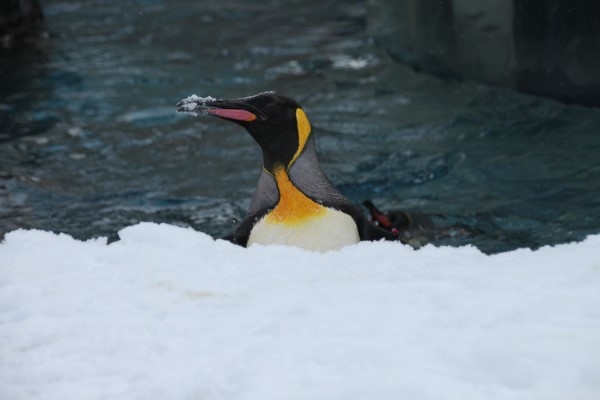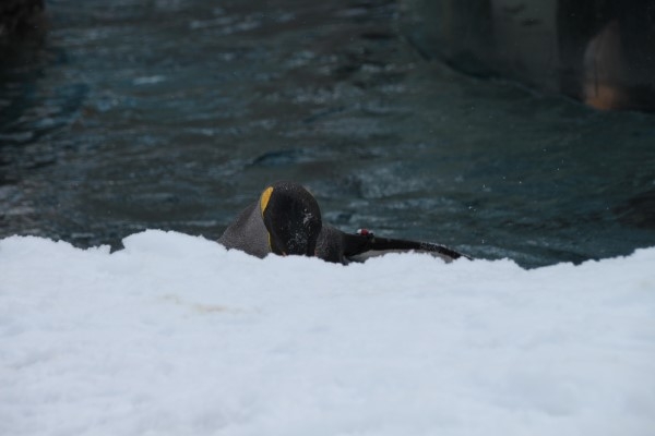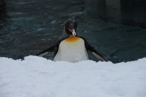 やっと水中に張り出した部分に立つことができました。スロープに積もった新雪が胸にもクチバシにもくっついてます。
