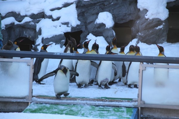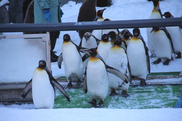 ある日の旭山動物園ペンギン散歩、たいていはゲートに詰めかけてオープンを待っているキング集団ですが、この日はやや離れて固まっています。相互に「おまえいけよ」状態でしたが、ついに1羽がゲートに近づき、ーーーーーーーーーー