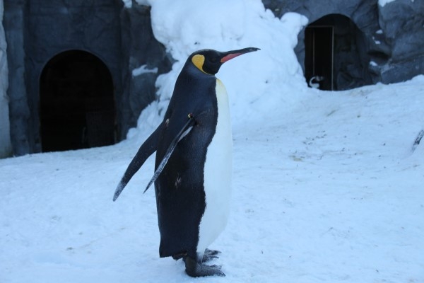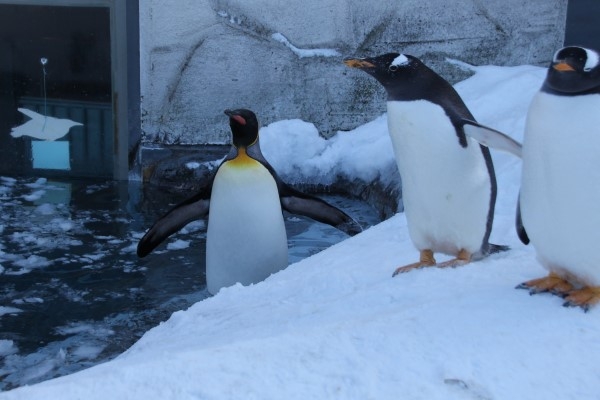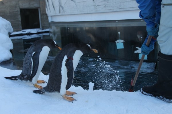 前回、氷雪のスロープに阻まれて上陸できないでいた旭山キングのモモタ君、午後2時過ぎになって飼育員さんが気づき、硬い雪を削ってくれました。作業を見守るジェンツーたち。
