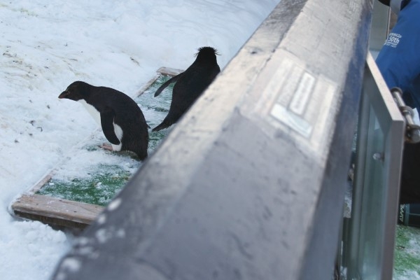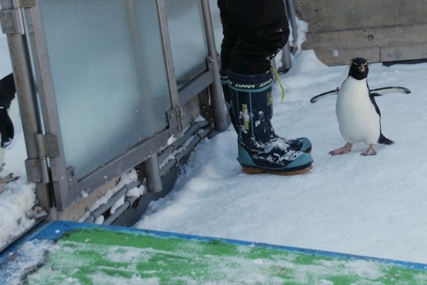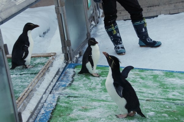 ペンギンが板にのっかってズリズリと引っ張られてます。旭山動物園、ペンギン散歩ご帰還の準備をする飼育員さんとイワトビの楽しい光景。こどもの頃、親に布団ごと引っ張られたことを思い出します。