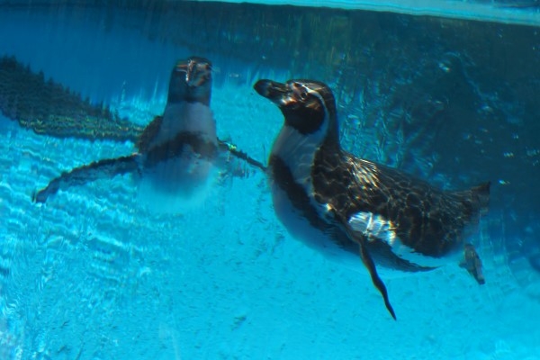 「だれや?て、自分やがな」 鳥羽水族館のフンボルト、アクリルに映って分身の術。