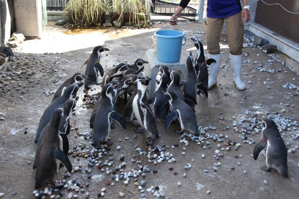 森きららのペンギン給餌タイム風景です。多くのペンギン施設で目にするのとは少し違います。森きららのフンボルトたちは、飼育員さんの足をつついたりしないんです。「つついたらサカナもらえない」ことを教えたのだそうです。ペンギンもちゃんとわかるんですね。