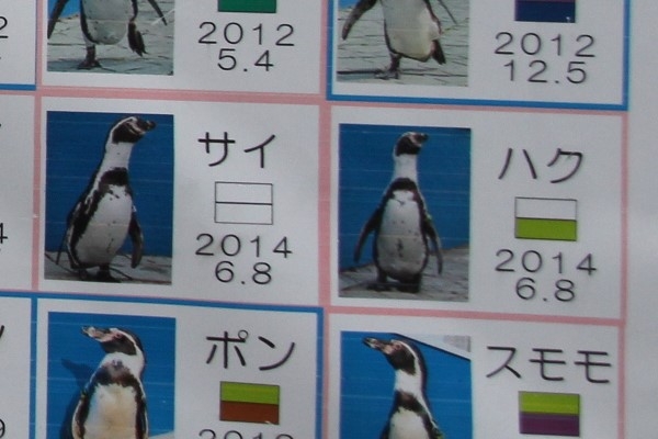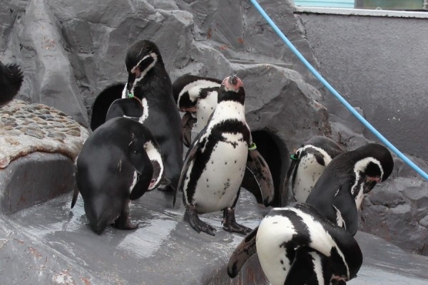 南知多のフンボルト、真ん中にいるのはハクちゃんです。ハラの模様が、なんだかフクロウのイラストに見えてしまうのが目印。でも、よく似た模様の個体が1羽います。