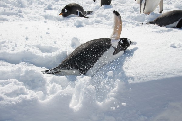 ふかふかの雪が気持ちよいのでしょう、おたる水族館のお散歩ジェンツー集団。泳ぐような動きですが、フリッパーは振り回しているだけ。足でかいて進むのですが、雪が深いと雪を蹴立てるだけでなかなか進みません。