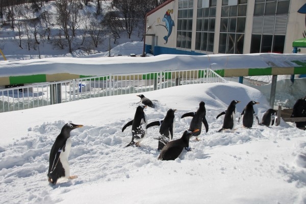 おたる水族館のペンギン散歩、帰り道です。まだ遊び足りないのか、雪にダイブして寄り道するジェンツーがいます。仲間が列になって歩いて行くのに。私としては、最後尾のひょうひょうとした歩きぶりがいいと思います。たぶん最長老のダディ君。