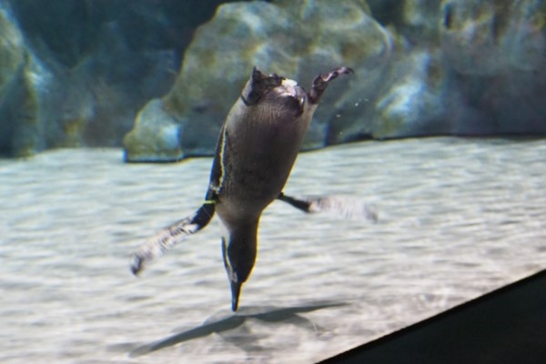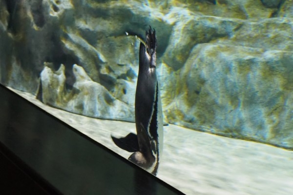 美ら海(ちゅらうみ)水族館のフンボルト、キコちゃん。プールの底で逆立ちの練習? 背中側に倒れてしまい、何度もやり直していました。足とおしりがめちゃキュートです。