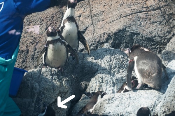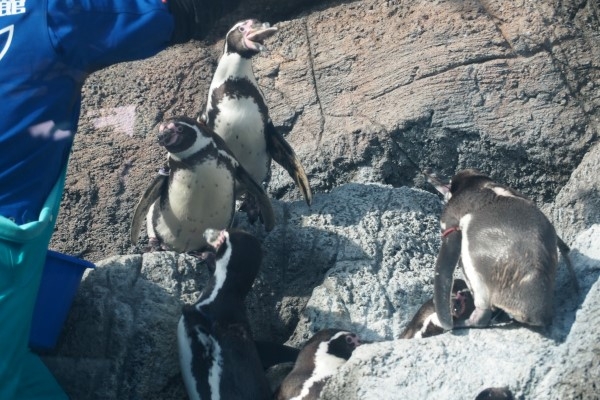 鳥羽水フンボルトの皆さん、ランチタイムは大騒ぎです。真ん中のフリッパーを広げている1羽、わずかな足がかりで垂直の岸壁に登り、有利なポイントで「ちょうだい」アピールをしていましたが、