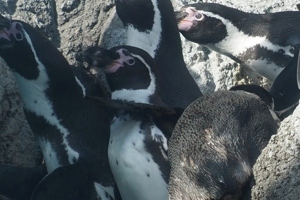 鳥羽水のフンボルトお食事タイムは続きます。円の中、急斜面から落ちかけた個体が、近くの仲間にフリッパーでつかまる、ことはできませんので、支えにしてナントカしようとします。支えにされた個体の顔、