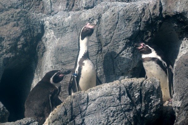 鳥羽水のフンボルトが、首伸ばしのモデルをしてくれます。真ん中は真上に伸ばした状態、左はぐっと縮めている状態。