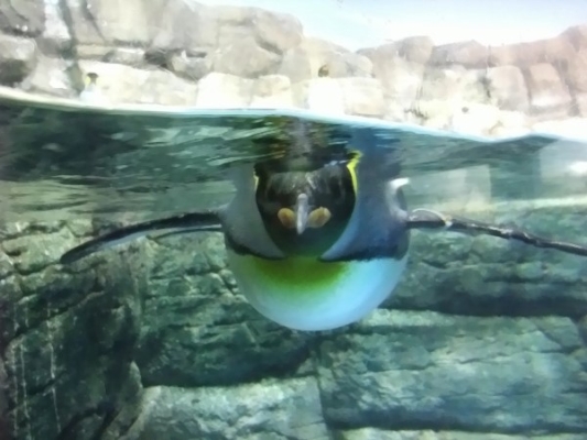 胴体の断面はほぼ円形となるでしょう。立っているときはカーブしている体側の黒ラインが、正面から見ると左右真っ直ぐになっているのが新発見。キングの正面図、八景島シーパラダイス。