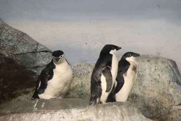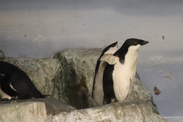 名古屋港水族館では、冬が子育ての季節。照明が南極大陸モードだから、日本の冬がペンギン室では夏になるのです。ヒゲペンギンの巣の前にいる2羽は、ヒゲではなくてアデリーの亜成鳥。顔の下半分が白いのでオトナと見分けがつきます。