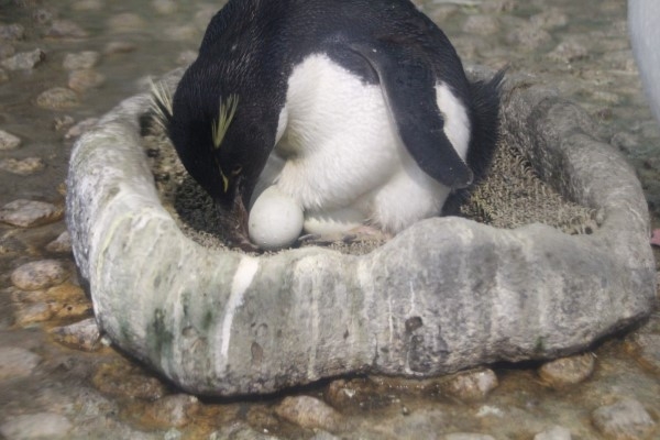 海遊館のミナミイワトビ、何組もペアが成立しています。こちらは平地にある巣で、お母さんが抱卵中。時々タマゴの配置を決め直します。こうすることで、まんべんなく温まるのだそうです。よく見るとタマゴは2個。5月下旬の様子です。