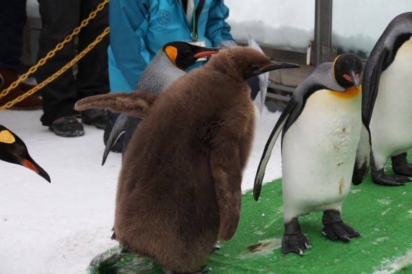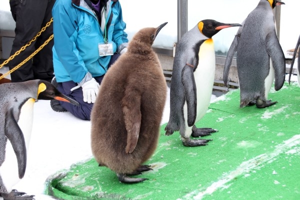 旭山動物園のキングひなちゃん、お散歩の帰りに、足がマットに引っかかってしまいました。オトナが気づいて様子を見ていますが、親ではなくて、よそのおばさんのようです。お父さんがヒナの向こう側についています。