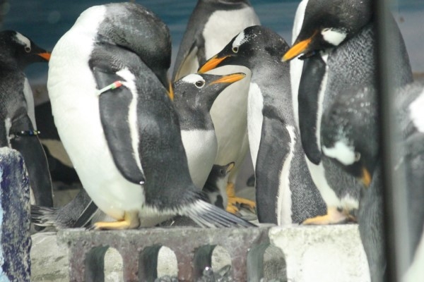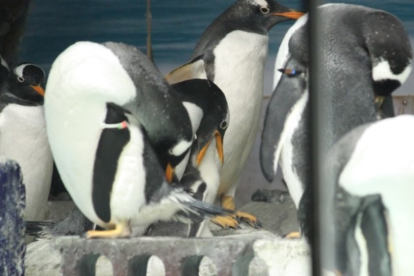 名古屋港水族館のジェンツーペンギン、よーく見ると親の腹の下にヒナがいます。クチバシの黄色は親とおそろい。