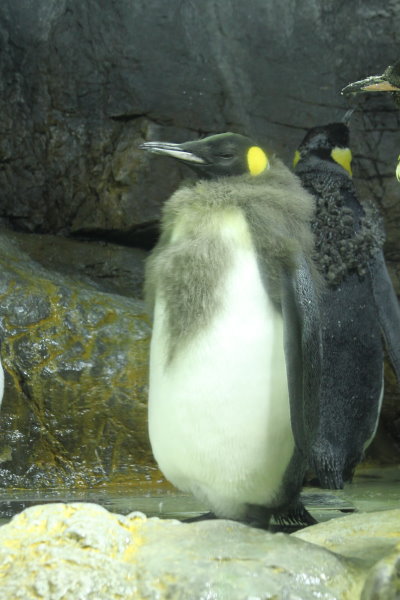 こちらはヒナがオトナの羽に生え替わっているところ。最終段階ですね。ヒナは全身焦げ茶色ですから、白いハラもグレーの背中も、残っているヒナの羽は全部焦げ茶色です。そして羽の形も異なります。モデルはどちらも海遊館のキング。