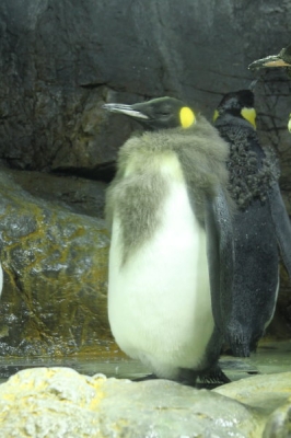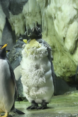 海遊館のキング、換羽中の図。ヒナの羽が生え替わるところではありません。年に1度、古い羽を落として新しい羽にします。もともとがオトナの羽ですから、ハラの羽は古いのも新しいのも白。身体のどの部分も、羽の色は新旧同じです。