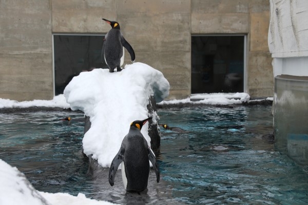 飛び込むの? 降りてくるの? 次の方が待ってますよ。ペンギンプールの小島にも雪が積もっています。ここを登るペンギンがわりといるので、雪が踏み固まっています。旭山動物園。