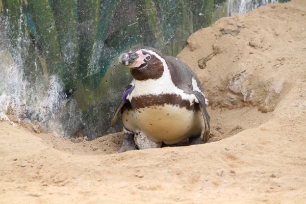 越前松島水族館のフンボルト、土を掘って作った巣穴で抱卵中。チラリと見えるタマゴ。ペンギンは通常、タマゴ愛ヒナ愛が特大です。自分たちのタマゴは誰にも渡さん!という気迫が感じられます。