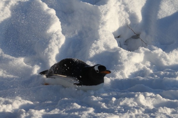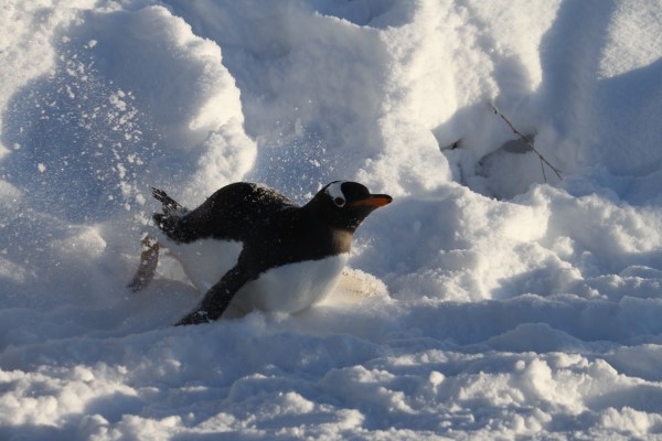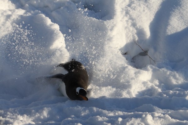 雪の斜面を腹ばいで降りてきたジェンツー。足でかいて進むので、派手に雪を蹴散らします。雪には通った跡が溝になっています。