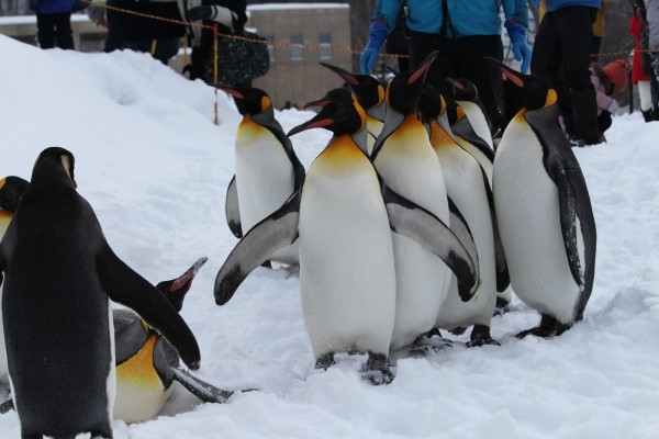 「ちょっと、メイワクやであんた。」 「わしのかってや。」旭山散歩の途中で行列を妨げる格好の腹ばいキング。ぎゅうぎゅうと渋滞が発生しています。わざわざ向きを変えてオトナたちの騒ぎを見ているのは亜成鳥です。
