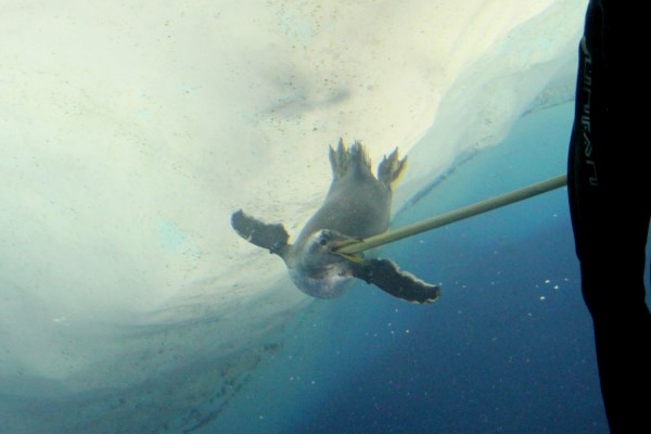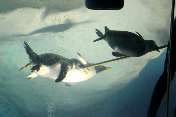 名古屋港水族館の水槽掃除を邪魔するジェンツー。仲間と一緒に、モップの柄をガップリくわえています。亜成鳥のようです。